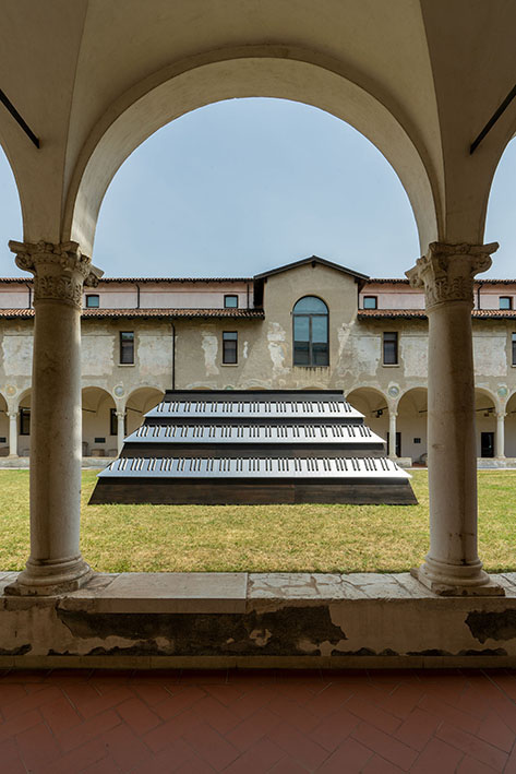 Nell’incanto del Chiostro rinascimentale s’incontra, disposto sul prato, L’armonium delle allodole impazzite, un enigmatico e monumentale strumento musicale, sul cui perimetro corre una sequenza di tasti di pianoforte.