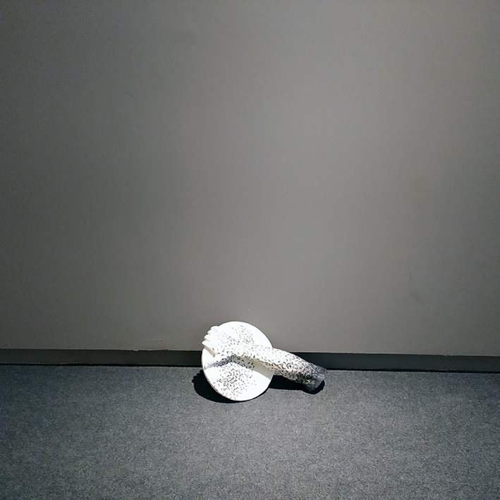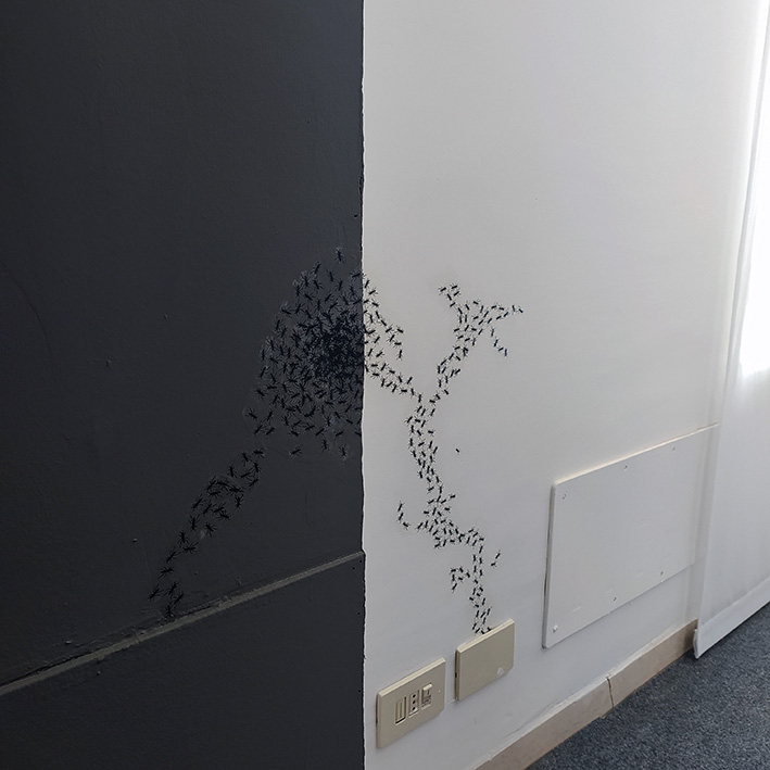 Al centro del percorso una scultura, Il discobolo (2022), che si presenta cancellata da formiche ma riconoscibile per la sua tipica postura e per quel disco lanciato, insieme alla mano e a una parte dell’avambraccio, in altra parte dell’esposizione.