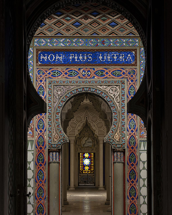 Influenzato dalla fascinazione per l’Oriente, il marchese progettò personalmente un apparato decorativo sbalorditivo. I 5.500 metri quadri interni sono un susseguirsi di sale a tema – dalla Sala d’Ingresso (1853) al Corridoio delle Stalattiti (1862) – che celebrano l’architettura moresca, indiana e cinese attraverso complesse geometrie, stucchi policromi e rilievi raffinati.