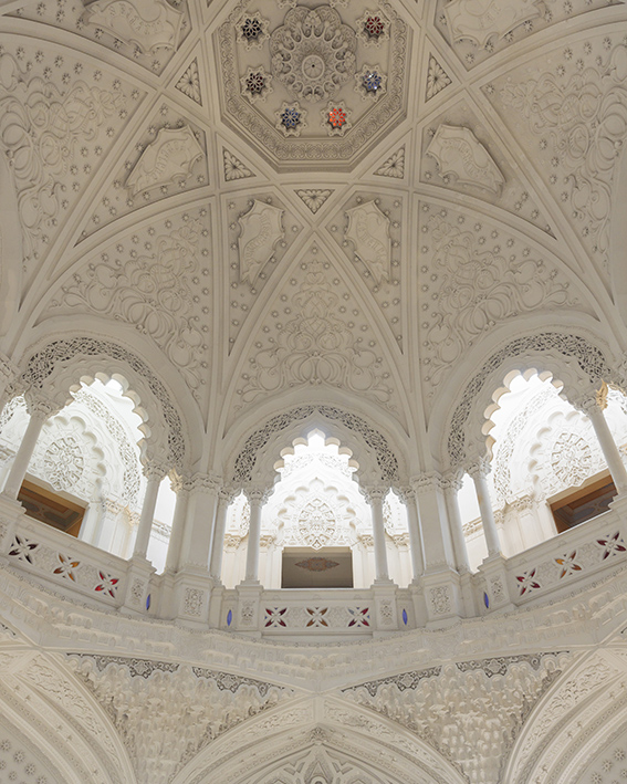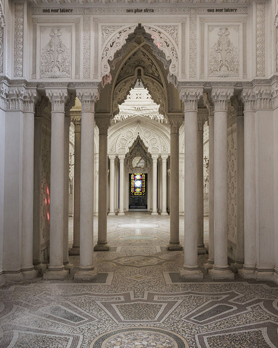 Influenzato dalla fascinazione per l’Oriente, il marchese progettò personalmente un apparato decorativo sbalorditivo. I 5.500 metri quadri interni sono un susseguirsi di sale a tema – dalla Sala d’Ingresso (1853) al Corridoio delle Stalattiti (1862) – che celebrano l’architettura moresca, indiana e cinese attraverso complesse geometrie, stucchi policromi e rilievi raffinati.