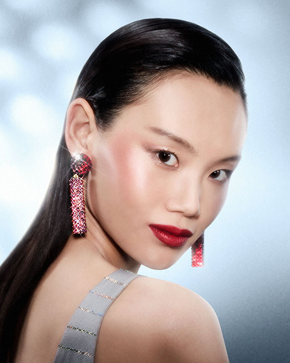 Le labbra chiudono il look con il Lip Power 405, il famoso rosso “Sultan”, una nuance calda e speziata che rende questo stile ipnotico e indimenticabile.
