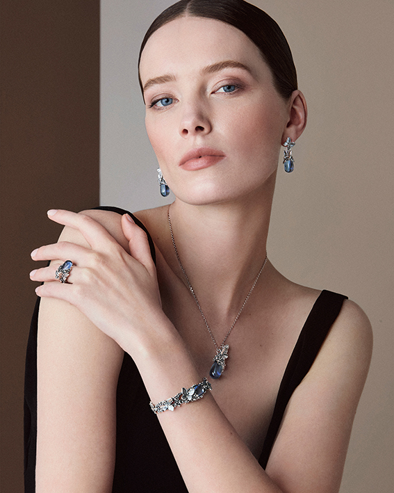 Blue Ivy si caratterizza per la sua luminosità, il colore vibrante e la versatilità nell’indosso. La collezione utilizza numerosi cristalli rotondi sfaccettati in una palette tricromatica che esplora le sfumature del blu: celeste mare, azzurro intenso e verde smeraldo. Il design in fusione d’argento, ispirato a micro-fiori e arricchito da sferette brunite, abbraccia ogni pietra, creando un effetto di grande impatto visivo. La linea include 10 pezzi, tra cui una collana, pendenti, un bracciale, anelli e orecchini.