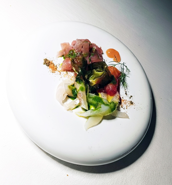 Tra le proposte d’apertura, ad esempio, si spazia da un benvenuto come la crema di carote con polpo, un gioco di contrasti tra la morbidezza dolce della crema e la piacevole consistenza del polpo, fino a uno dei punti di forza del ristorante: la degustazione di ostriche. Queste vengono proposte in un ordine di intensità crescente: si parte dalla Perla del Delta italiana, si prosegue con la Etoile della Bretagna del Sud, che sorprende per il suo contrasto tra la decisa nota salina e un finale dolce, per finire con la Peter Pan di David Hervé di Marennes Oléron, un’ostrica dalla polpa compatta e dal gusto equilibrato. Anche il crudo è un capitolo fondamentale. La composizione del piatto è studiata per esaltare ogni singolo elemento: il tonno in purezza, il salmone marinato alla barbabietola che acquista una nota dolce e un colore intenso, la delicatezza del San Pietro e quella del branzino, rinfrescata da un gel al pompelmo. Un’alga completa la guarnizione, aggiungendo una chiusura sapida e marina.