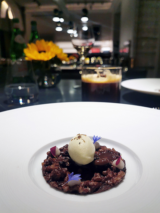 Vira invece sui toni della freschezza la tartare di calamaro, servita con gelato alla birra scura e liquirizia e zuppetta fredda di piparra, peperone tipico del nord della Spagna che chiude il cerchio.