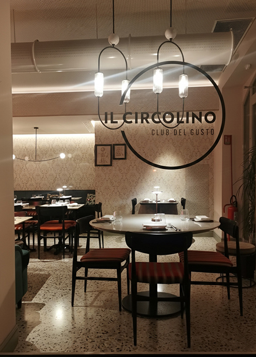Prima di arrivare a tavola vale la pena prendersi un attimo di tempo per ammirare i dettagli d’arredo, ispirati agli storici circoli italiani, con tanto di richiamo ai giochi che da sempre ne fanno parte, carte e scacchi, ma con uno stile internazionale e minimalista. Aprendo la porta la vostra vista sarà super stimolata da colori e materiali, sedute, quadri, e dallo scenografico bancone del bar. Con questo mood il passaggio dalla zona bistrot al ristorante regalerà un ulteriore senso di stupore, per il bellissimo lavoro di recupero dal contesto originario sulle arcate in muratura e le colonne in pietra con capitello corinzio, che incorniciano la cucina a vista.