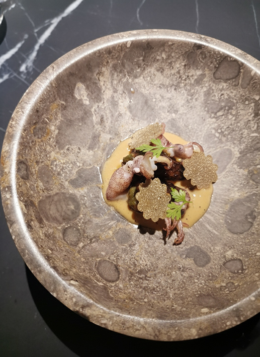 Vira invece sui toni della freschezza la tartare di calamaro, servita con gelato alla birra scura e liquirizia e zuppetta fredda di piparra, peperone tipico del nord della Spagna che chiude il cerchio.
