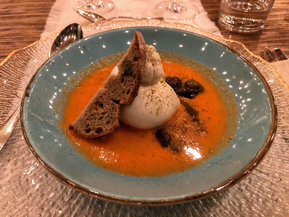 Un’esperienza a sé stante è la visita a Conti Thun a Puegnago. Più che una semplice cantina, è un agriturismo di charme nato sulle rovine di un antico possedimento nobiliare. Qui la degustazione si trasforma in un vero e proprio percorso gourmet. Si inizia con un Gaspacho con burrata, crostini e una polvere di capperi e olive taggiasche, un antipasto fresco e vivace, ideale in abbinamento con il loro spumante rosé Bolle di Micaela. Questo 100% Groppello, con le sue note di fragoline e lampone, pulisce il palato e prepara alla portata successiva.