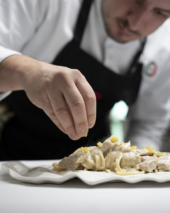 Il menu è un racconto che segue il ritmo delle stagioni. Ogni piatto è una pennellata d’autore. Si può iniziare con l’incredibile gioco di consistenze dei “Salumare”, salumi di mare che sfidano ogni preconcetto, o con la pura eleganza di un Crudo di cefalo dry aged, un equilibrio sublime tra la potenza del pesce e la delicatezza della panna. Si prosegue con primi che sono un ponte ardito tra mondi, come lo Spaghettone cacio e pepe, coregone e limone fermentato, dove l’irruenza romana incontra la timida sapidità del lago. Nei secondi, il fuoco libera l’essenza della frollatura in un Tonno rosso dry aged alla brace che si scioglie al palato.