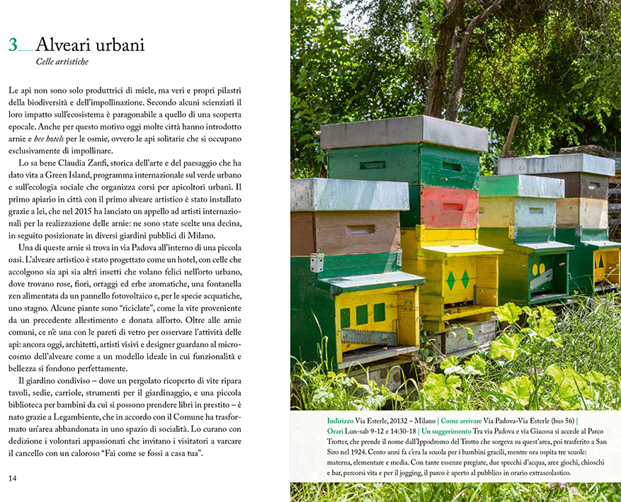 La vera anima “green” che questa pubblicazione vuole svelare è nel ronzio degli “Alveari urbani” di via Esterle (zona via Padova). Qui, in un’ex area dismessa, la storica dell’arte Claudia Zanfi ha dato vita a un progetto che fonde apicoltura (essenziale per la biodiversità) e design, invitando artisti a creare “alveari artistici”.