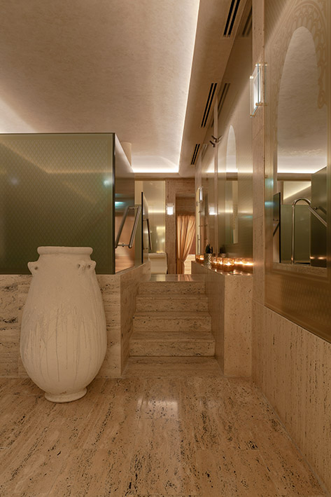 Il viaggio “sensoriale” inizia in una elegante vasca per idromassaggio dal particolare appeal e realizzata in mosaico a foglie d’oro, disegnata per garantire agli ospiti totale relax quanto assoluta riservatezza.