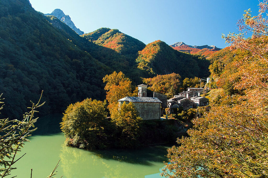 L’autunno in Garfagnana e nella Media Valle del Serchio si traduce in panorami di straordinaria bellezza, dove storia e spiritualità si fondono con il paesaggio. Siti emblematici come la Fortezza delle Verrucole o l’Eremo di Calomini offrono scorci di rara intensità. I borghi più belli della Garfagnana – tra cui Castelnuovo di Garfagnana, Isola Santa, Barga, Trassillico e Coreglia Antelminelli – celebrano la castagna con manifestazioni dedicate. Nel Parco dell’Orecchiella, i sentieri si inoltrano tra conifere e castagni, rivelando improvvise vedute. La Via Matildica del Volto Santo, con tappe come il Sillico e il Giro del Diavolo sopra San Pellegrino in Alpe, invita a un turismo lento e contemplativo. Isola Santa, con il suo specchio d’acqua che riflette i colori del foliage, è una visione d’incanto. Per chi ricerca angoli di autentica solitudine, la Val Fegana offre una quiete autunnale indimenticabile.
