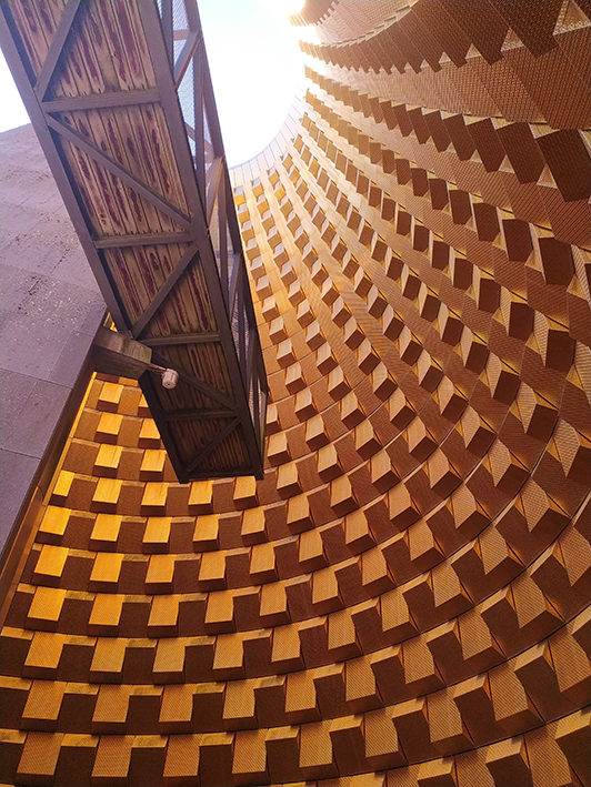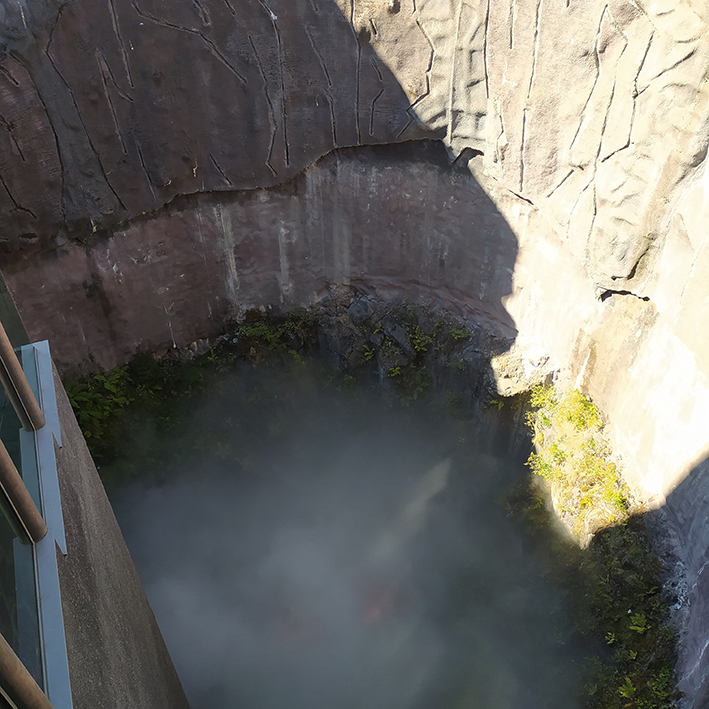 Ha al centro un’architettura imponente dalla forma conica che vuole richiamare il profilo classico di un vulcano, ma la maggior parte delle installazioni è celata sotto terra.